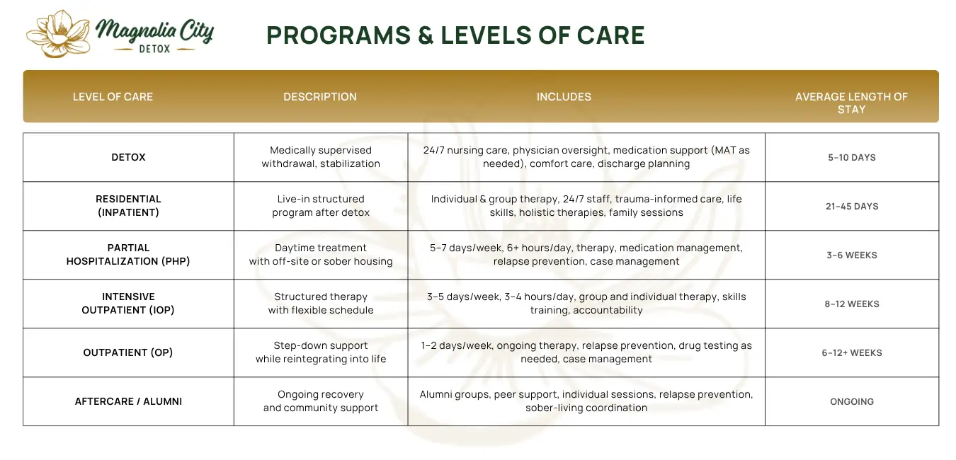 Magnolia City Detox offers multiple levels of care designed to meet clients where they are in their recovery journey.